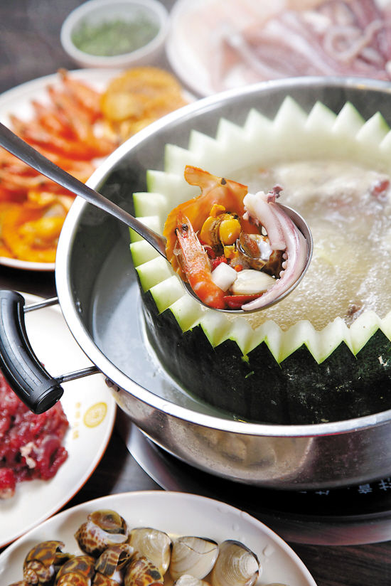 譬如南海、番禺一带兴起的冬瓜盅火锅,就喜欢掏空半只大冬瓜来当“锅”。冬瓜连皮连汤煮开了以后,直接把各种配料放下去涮。让食客既有吃火锅般的热闹感,又可以不上火地将冬瓜的清凉尽情吸收。